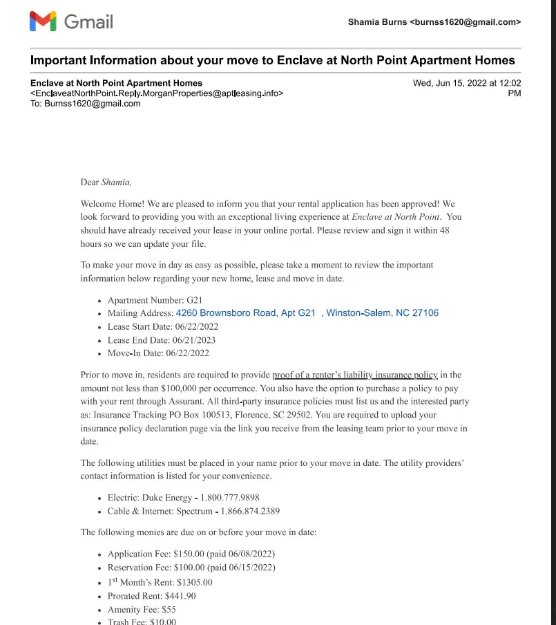 a HCV can only move in on the 1st of the month. However, Syndey Bates submitted the (RFTA) Request for Tenancy Approval paperwork to Housing on the 26th of October and informed Andre that Housing would have to inspect the property by the 31st of October for approval to move in on November 1st, or he would have to apply again. Andre never received a response or update on if he was approved or advised of any steps after. I also try to get assistance as a tenant of Gwynnbrook on this matter from Tanesha Foster-Assistant Property Manager to be met with such dismissive customer service.