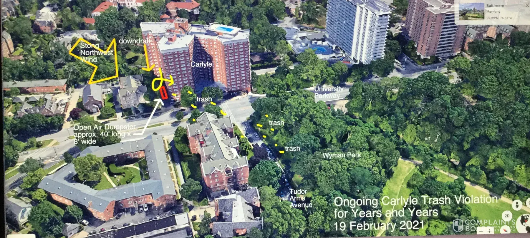 For many, many years an uncovered 40' long open uncovered Dumpster at the Carlyle Apartments in Baltimore at 500 West University Parkway has been blowing trash into the streets, adjacent properties and the adjacent Wyman Park designed by the noted landscape architect firm of Federick Law Olmsted. We have contacted the local property manager at the a...
