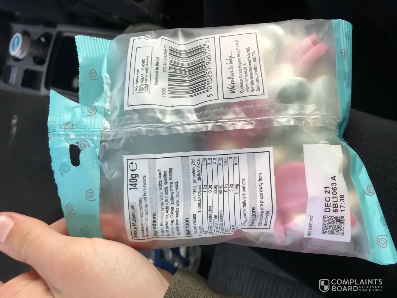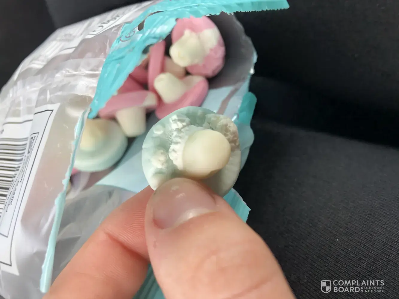 I am filing a complaint as I am extremely unhappy with my packet of foam mushrooms that I received. Whilst eating them I noticed that several had hard white lumps of something on, which I actually couldn't eat. Therefore about 1/3 of the bag was wasted and had to go in the bin, and I am therefore not getting my money's worth that I paid for. I hope you can resolve this, so that I can continue to purchase the sweets from Morrison's as at the moment I am not at all satisfied with what I have bought.