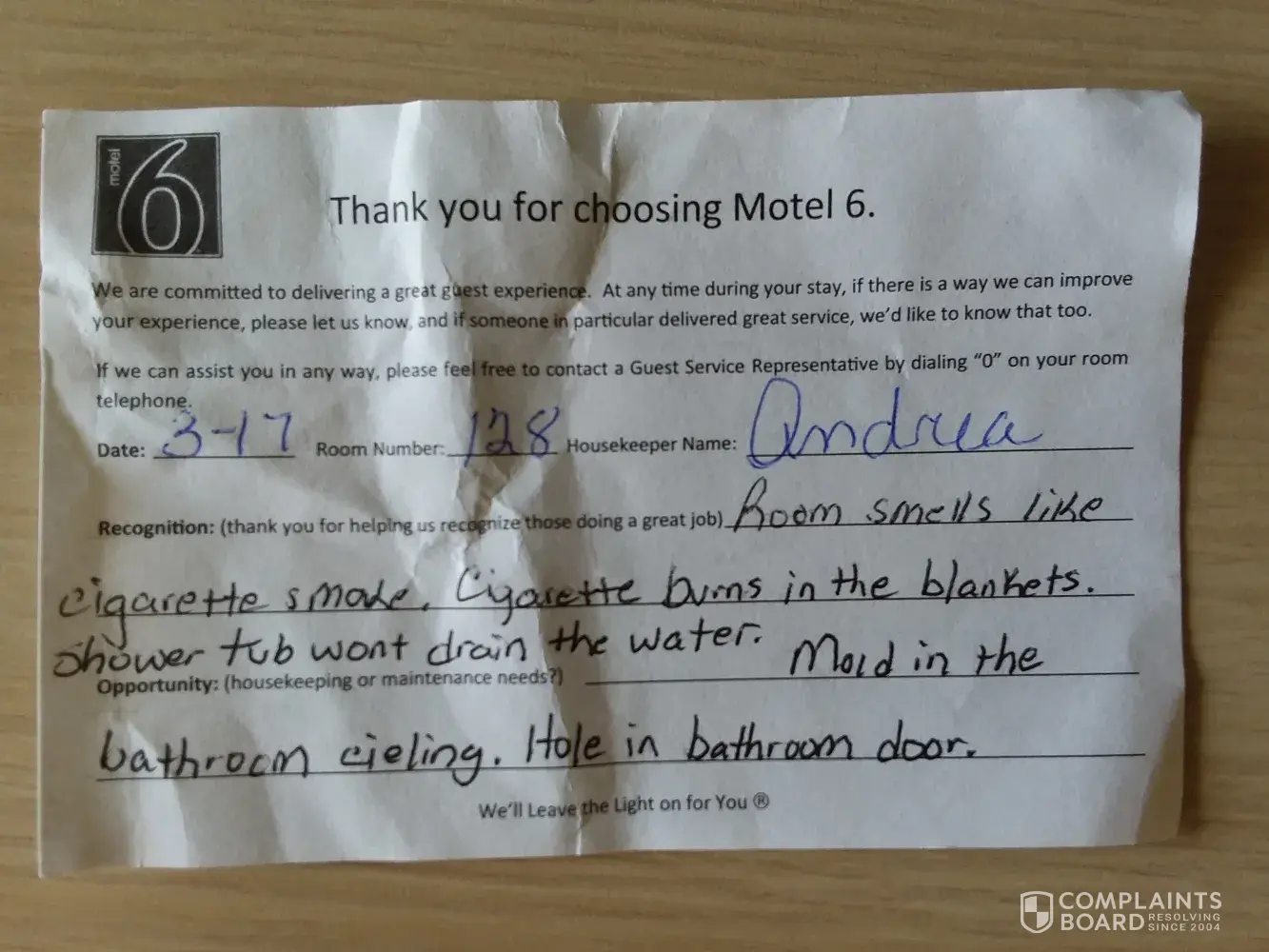 I checked into the Motel 6 in Gadsden, Alabama on the night of 3/17/2018 to get some sleep while en route to Gulf Shores. I requested a non smoking room and was asked to sign a form stating there was $150 fee if I smoked in the room. Since I don't smoke, I was happy to sign it. Once I got to my room there was an overwhelming odor of cigarette smoke. We found cigarette burn holes in the comforters and sheets. So why am I signing a $150 form for a non smoking room? And why give me a room that it's painfully obvious people smoke in when I asked for a non smoking room? Also, there were holes in the bathroom door, mold in the bathroom ceiling, the bathtub wouldn't drain out the water, and stains on the carpets. I was highly disappointed in the rooms condition and obvious lack of attention by the staff and management.