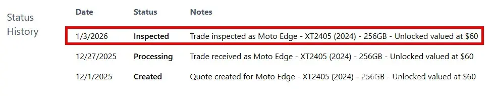 My PERFECT CONDITION UNLOCKED device was inspected, but somehow it has NO VALUE over and above the base $60 discount. This is now a VERIFIED SCAM. I'll never buy another Motorola product of any kind.