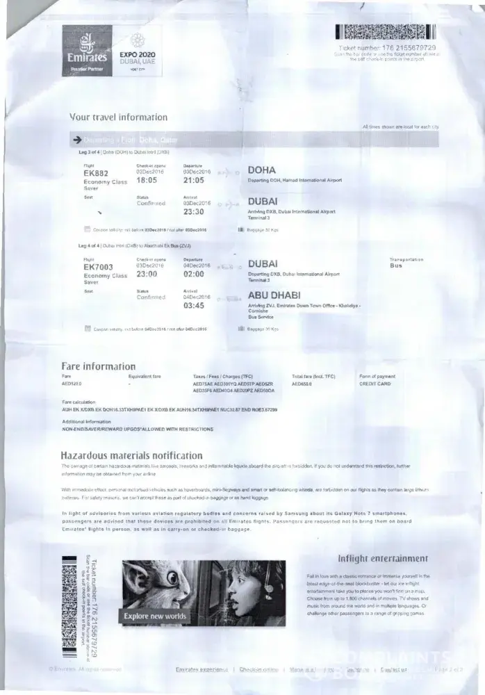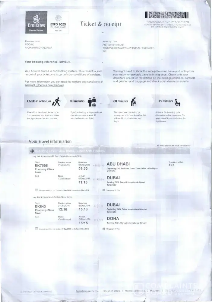 last 01/12/2016 i have travel from Dubai To Doha by emirates airlines, ticket number :[protected] . Doha emigration Department not issued the Qatar visa for me, so, i back to Dubai by next flight of emirates airline. Emirates Air stuff taken QAR 250 by cash and given hand writing board pass no. 176-[protected] they told me, payment receipt it will send by mail but not yet send me. last 06/12/2016 i have contact with emirates Airline contact center than they send me a payment receipt with QR 200. but i have paid QAR250.
