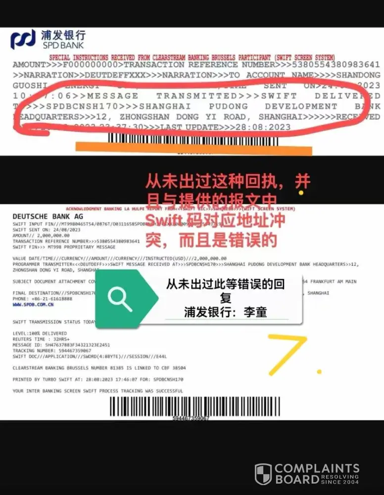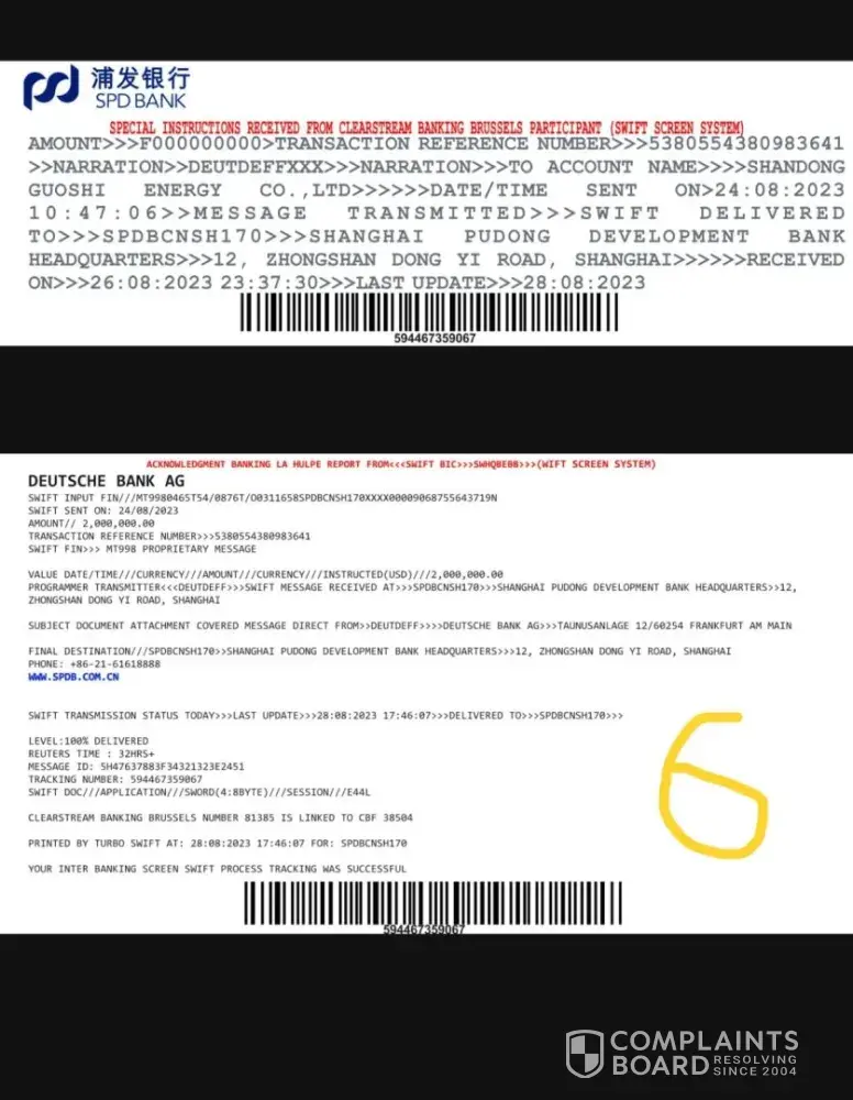 At the China end, SPD Bank told their customer, Shandong Guoshi Energy Company not to bother them anymore as the so-called acknowledgment from them was fake and the tracer was also fake. (Document marked 7.) and that there was no cash backed APG anywhere within the SWIFT system against which Shandong Guoshi Energy Company could transact. This was already as of 7th September, 2023.