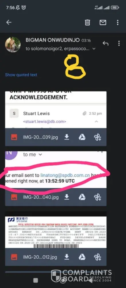When asked why we were not copied in the email directly from Deutsche Bank when the bank sent the SWIFT APG to SPDB and the Provider, Dr. Marion Henschel, who should be in possession of copy of the instrument issued against her account, Mr. Onwudinjo claimed that Deutsche Bank could not reach our emails. He then sent us a screenshot of the email addresses that were supposed to receive the email from Stuart Lewis stuart.[protected]@db.com (who at that time was no more an employee of Deutsche Bank) (Document marked 4.) and that the mail sent to SPDB was delivered. (Document marked 5.). In effect we never got any correspondence/copy mail from the so-called Dr. Marion Henschel of Strabag AG or from Deutsche Bank, the issuing bank. All we received were from Mr. Onwudinjo himself.
