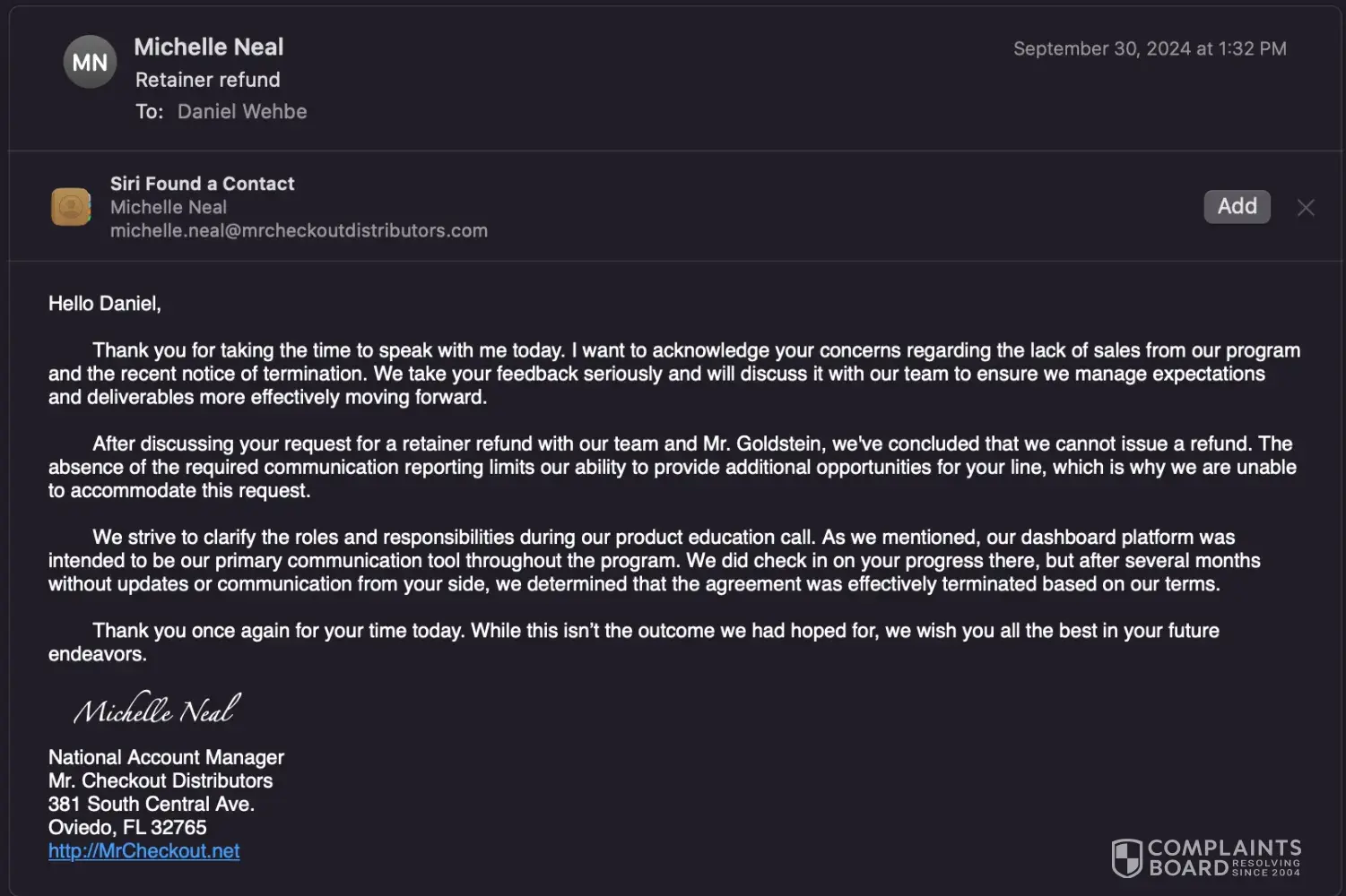 I am writing to file a formal complaint against Mr. Checkout regarding the non-return of a retainer fee of $2,500, which has not been refunded as per our agreed terms. Additionally, Joel of Mr. Checkout has refused to engage in any conversations to resolve this matter. About 2 years ago, I engaged the services of Mr. Checkout for to bring me orders, and a...