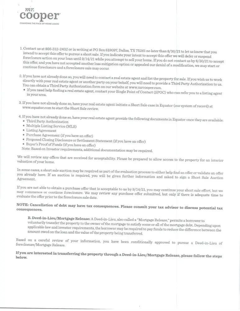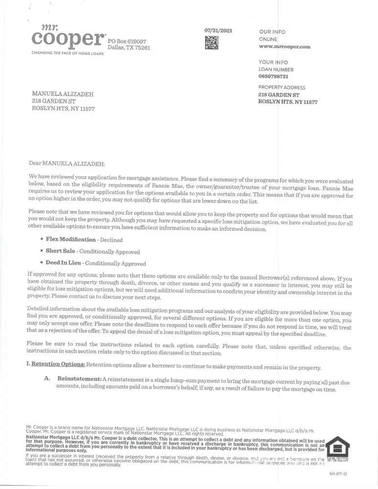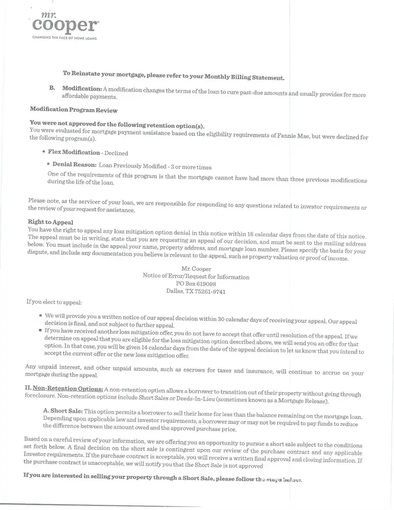 Mr. Cooper - Loan # [protected] Mr. Cooper denied a Loan Modification after Forbearance ended. The day after forbearance ended I received a denial letter that my only options were a lump sum payment or a short sale or a deed in Lieu. I have owned this home since 1993 and refuse to give it up after so much money spent in order to maintain it plus this is my...