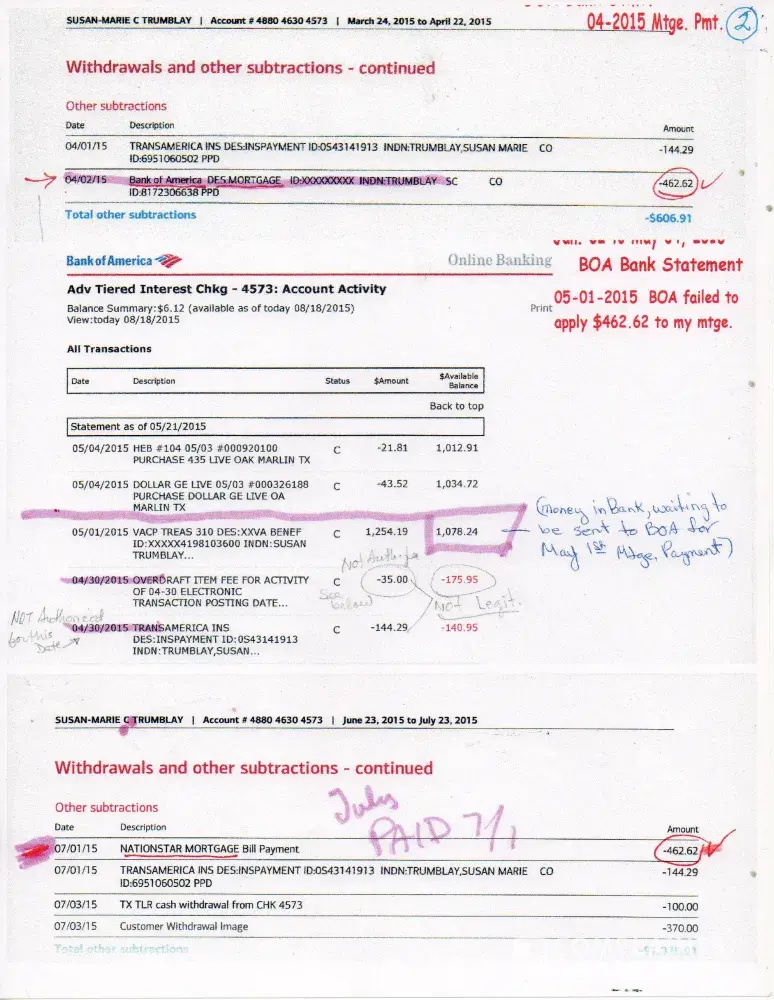 BOA did a transfer of servicing to Nationstar when they had NO legal right to do so, as my Mortgage pkg. Papers stated plainly that "We MAY NOT sell or transfer this loa_ . (I put "loa_" because while the actual paper uses the full word, your site will not allow me to use the whole word.) I had that to protect me from going thru a MESS like I did in 1978 and in 1993. However, they do NOT care abut obeying LAW! And they went ahead an transferred it anyway! I had a PERFECT pay history from Dec. 2010 up to May 1, 2015, when BOA failed to abide by our AGREEMENT for BOA to do a recurring payment on the 1st of each month out of my BOA checking account. They are required by law (US CODE 2605 -regarding mortgages) to give 15 days notice before sale or transfer, and Nationstar is required to notify me no later than 15 days after the transaction! Neither obeyed the law! And I got a Foreclosure THREAT on May 30th - holiday weekend, giving me until the next day to pay over twice my payment ! (For more info - check out "US CODE 2605" - about law re: mortgages) After I later re-did the auto pay to Nationstar, with a separate single payment for MAY and another recurring one beginning with June 2nd, on JUly 28th I discover they took out over $100 more than what I authorized, on June 2nd, 2015 and did it in ONE payment instead of the TWO separate payments. In order to get my $100+ back, I had to refuse the whole payment, and I immediately resent the payment in TWO checks - one marked May and one marked June, and they were for a larger amount -$489.70. Then on July 28th, 2015, they sent me another THREAT to foreclose saying JULY payment was not paid - I checked online and it WAS paid on July 1st, 2015! They continued to deny I paid all the way thru Sept! Since the escrow part of my payment was not enough, I called and tried to talk to them about what it should be, and they refused to talk to me! So I added $30 a month. and went on from there - Then they decided my payment was even more than that - and demanded I pay more. They forget the LAW requires them to notify me in ADVANCE (10 days I think) AND they must explain in DETAIL what the increase is for. That is the LAW - and Nationstar again broke the LAW. They took out TWO payments on Aug. 4th, without my authorization, and they charged me late fees on every payment I made, even though I paid on time - and when I demanded they give it back, they claimed they were going to apply it to the Sept. payment - I said I needed it for food and gas for August, and they hung up! They never have applied that payment! When a congressman got on them, they sent a falsified statement dated 9-02-15, showing that there was $0 past due and NO payment due until Oct. 1st, 2015. They never thought congress would send me that statement! When I received that statement from congress, showing NOTHING was past due - that same day I got a letter from Nationstar saying that My Sept. payment was not paid and I was in DEFAULT, and again they THREATENED to foreclose. I was holding TWO papers from Nationstar - one said NOTHING was past due, and the other said I was past due for Sept.! Then 3 days later I get another letter from Nationstar saying I am past due for Sept. in the amount of $90, and another THREAT to foreclose. Remember, sending a THREAT in the US Mail is a FELONY! Each one is a felony. If I had actually been behind, legally it would not be considered a threat, but because I was NOT behind, it IS a THREAT! I intend to prosecute fully for EACH threat! When I called Nationstar and asked why they took my payment off my account, they asked what I meant, and when I referred to the Sept. 2nd statement showing NOTHING was past due, they almost shouted, "Where did YOU get that statement?" That told me they never intended for me to see that. They stated they took it back off my payment history, "because we thought we might need it later." That is ILLEGAL, and they illegally charged me a LATE fee - it was paid on AUG 4th, a month early, so why a late fee? They refuse to talk to me when I call, and they have "blocked" me from accessing my mortgage account online - this is illegal! I am 74 years old, and I have a special needs child still at home, and because of all this threatening, etc., I have not gotten more than 2-4 hours of sleep since the end of MAY - 6 months! Do to this stress, I had a mild stroke and fell down a flight of steps injuring both knees and both shoulders, I had to have surgery 10 days ago to repair the damage. I have contacted ALL of the appropriate agencies and NO ONE thinks either BOA or Nationstar really did much of anything wrong! If our TAX dollars are spent to have LAWS made, then by golly, enforce the laws and punish the wrongdoers - if YOU and I break the LAW - WE pay a penalty - why are the banks and mortgage companies allowed to get away with breaking the law over and over! I am trying to get a class action suit against BOA and one against Nationstar - if you are interested in joining in the fight against these wrong doers, [protected] is where you need to call, they will take your info and add you to the list. We cannot win if we do not fight, and we cannot lose if we refuse to quit until we win! I want all payments applied as they should be, all extra "fees" removed, my record CLEARED, and not one more mistake on their part. They should be required to pay for my medical bills, and the PAIN and suffering incurred, and more . . . . . If I "accidentally forgot to make MY payment for May, June, July, August, Sept, and Oct. - would they say, "Well, she did not mean to not make those payments, let's just go on and forget it.?" That is what all the "Enforcement agencies" told ME about Nationstar and BOA . . . . Many of my documents will not upload due to wrong format - I can e-mail or USMail them to you.