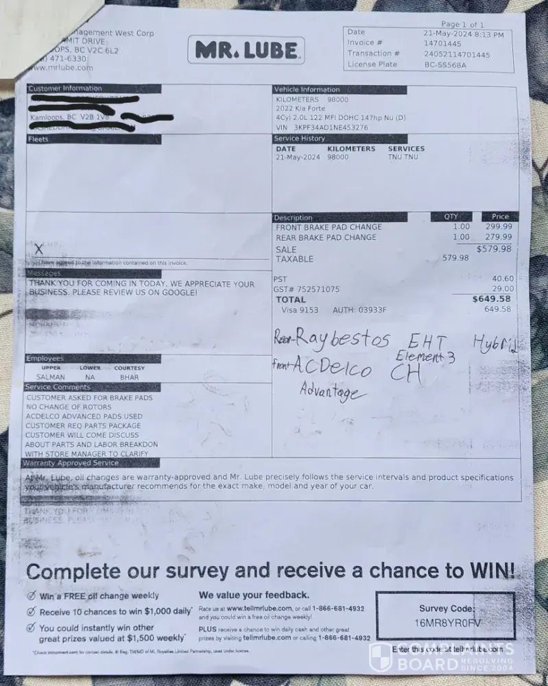 I visited Mr. Lube at Sahali recently to change the brake pads (not rotors) for my Kia Forte. They charged me an outrageous $649 with no breakdown of costs provided. Upon receiving the bill, I requested an itemized breakdown, only to be met with resistance and refusal from the staff. Despite my persistence, they adamantly refused to provide any transparency regarding their pricing. When inquired about the exorbitant labor rate of $140 per hour, I was given the absurd explanation that it was due to their policy of offering service without appointments. How stupid and surprising explanation! The fact is, they don't schedule appointments simply because they lack the volume of customers to justify maintaining an appointment system.