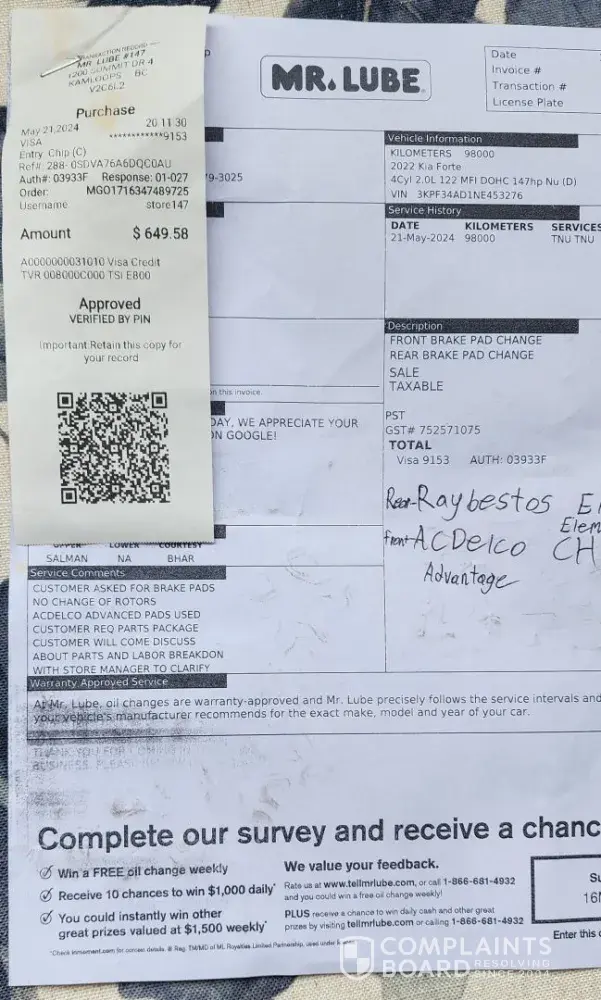 - While Mr. Lube Canada has a high level of trust, our investigation has revealed that the company's complaint resolution process is inadequate and ineffective. As a result, only 8% of 193 complaints are resolved. The support team may have poor customer service skills, lack of training, or not be well-equipped to handle customer complaints.