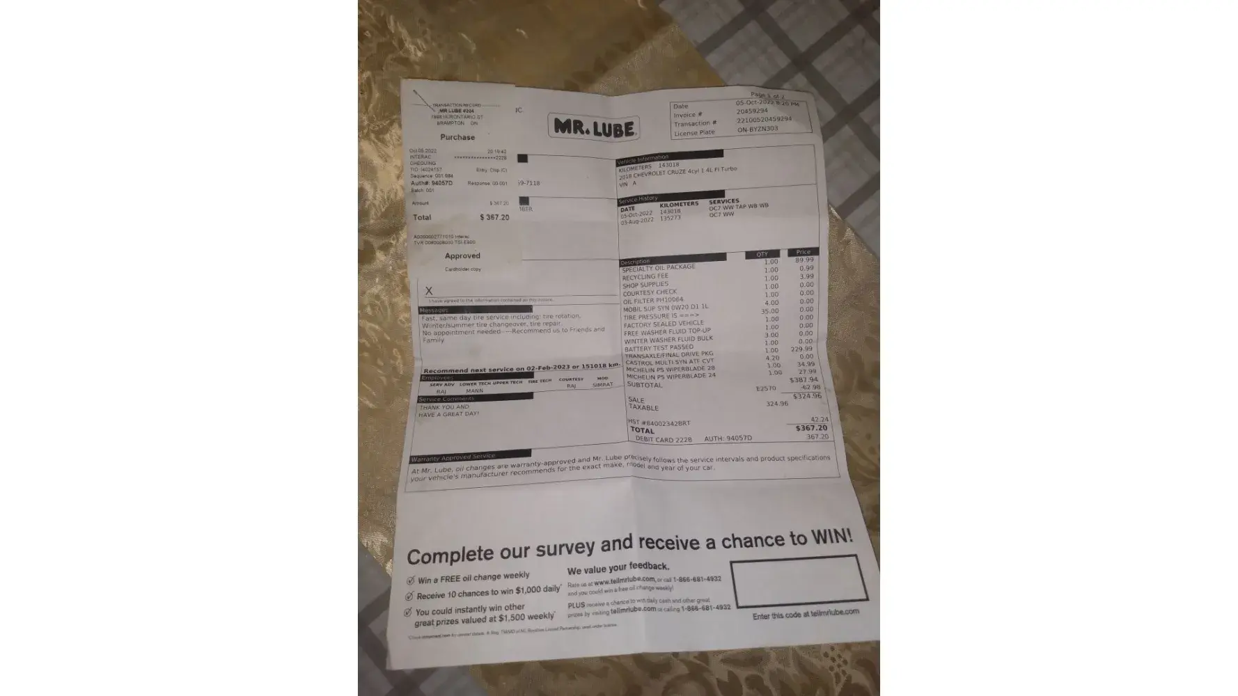 Hello. I recently visited the location at 328 University Drive, West, Lethbridge AB for an oil change on June 14th, 2023 @ 8:39 am after purchasing a new vehicle (used 2010 GMC Terrain SLE) for my Wife, and thought the experience was very positive. During the visit the staff was extremely attentive and seemed knowledgeable. Again, I went into this location specifically for an oil change, and did not intend on getting anything else done on this vehicle.