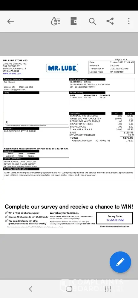 I was not charged for this inconvenience but there is no way to prove that because your team didn't keep my information. Looking back, I should have never even gave them my keys. But I made the mistake of trusting a brand to expect quality service. As a terrible bonus, your techs almost threw away my original rubbers. Unreal. Your tech said they were in the back. I'm glad I asked because they were not. I waited as they bagged them, and slammed that rear hatch shut - very much happy to have me leave I'm sure. He wouldn't even make eye contact with me when I asked for my keys. He knew the truth. I drove out the bay door and noticed my tire sensor light was on. The two "front" changed rubbers had a psi of 27 on the left and 21 on the right. My rear passanger rubber that was put back on had a psi of 31. My untouched tire was still at 35. Seriously? I didn't come in that way, as my sensors would have told me. Is this a normal practice to leave with different pressures, not even factory spec? Is this the level of quality that can be expected across Canada at all Mr. Lube + Tire? I get it it's a franchise and as a franchise owner you probably don't care. I do.