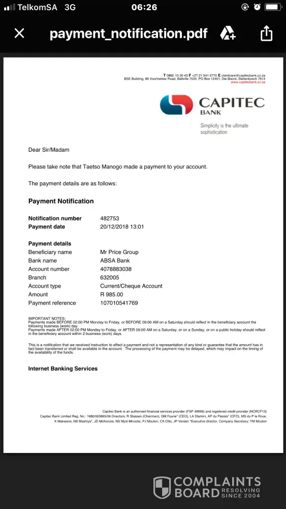 Am cynthia manogo and I have a problem that I faced when I was trying to buy clothes from mrp online shop. I purchased clothes on the 20 dec 2018 at 13:01 it's when I finished processing the payment but I didn't get any order number and on the app it showed order numbers and the status was canceled so the following day I called the call centre to ask if why didn't I get the order cause I have paid I only received a notification from my bank that I have paid mrp group r985, 00 the consultant said maybe the payment will reflect after 48hrs cause they're using absa bank. After 48 hours I called on saturday explain my problem and the consultant said I should call on sunday only to find out that the call center was closed on sunday then on monday I called and they said I should email my proof of payment and I did and called back they said I should send the proof of payment again cause they didn't receive it I send it but still no response again or any progress then yesterday which was the 27 dec 18 I called to ask if when can I receive the order cause I need it before the 29th and if it's possible can I change the store as am relocating and they said is not possible so I said can I then get the voucher even though I didn't want it but because it's late i'll take it they said I should wait for 48 to 72 hours again so the financial department can process the voucher. Now am so angry and disappointed because I brought online hoping the service is better than instore and the reason I brought online is because there were no sizes in store so now what I need is either I get the voucher before the end of today or just send me back my money cause it's been 7 days now calling the call center but not getting any where so am just tired of it. And that's my email [protected]@gmail.com