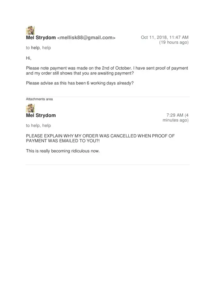 I Limnandi Mtshemla, acting on behalf of Yonela Mvambo, instructed to inform you that, Ms Mvambo placed an Order of the abovementioned shoe. An Order confirmation was received with order number #[protected]. Payment was made on 01.11.2018 and proof thereof was sent. On the 7th of November she was advised that a payment for the order has not been received. Yesterday she was advised that a payment has to be made within 48hours, failure to, the Order will be cancelled.