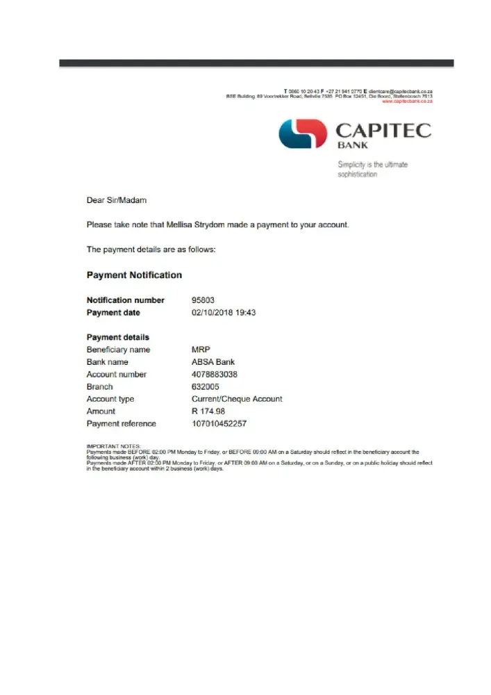 We confirm that a payment was indeed made for an amount of R230. a further payment of R20.00 was made for the delivery, however due to buttons of the machine, the Ref number ended up as "107160215G0' instead of '[protected]'.