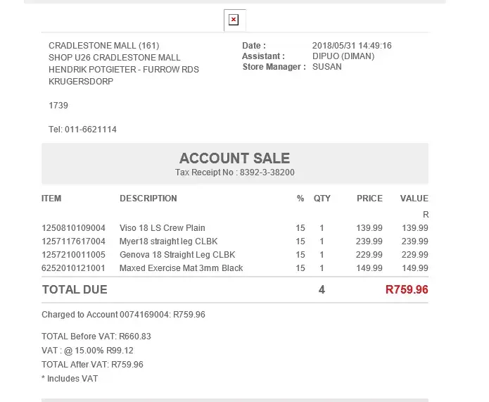 On Sunday morning, 15 July 2018, my daughter and I went shopping at the Retail Crossing branch on the West Rand. We both shop at Mr Price Home very often, and on Sunday she was shopping for bedding. With the assistance of a very helpful member of your floor staff, she purchased a duvet inner, two duvet cover sets, sheets, mattress protector and a velvet quilt. We also bought some diffusers, and other odds. In view of this complaint, I am sorry that I did not get the name of the helpful employee.