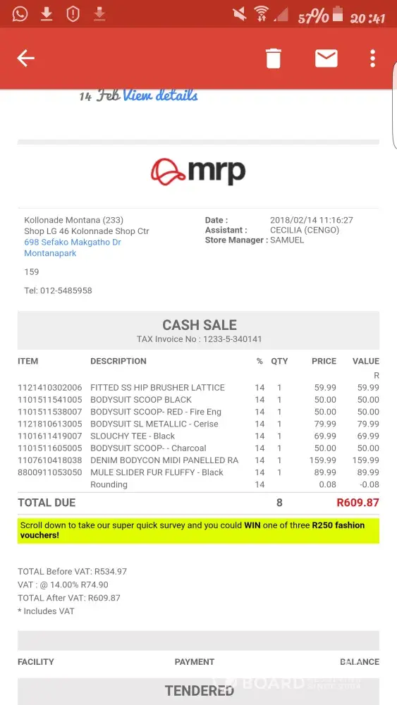 On 1 June 2018 I placed an online shopping order, I selected Express delivery to Somerset Mall and paid R35 with the understanding that the parcel will be delivered between 2 (or 3) working days. Since both the courier company and Mr Price work on Saturdays and Sundays the parcel was shipped& packed over the weekend.