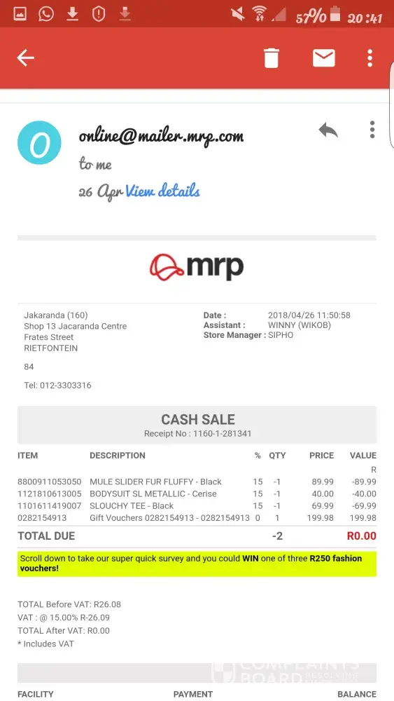 I purchased a metallic bodysuit at r79.99 which was never worn and still had the tag on it. I wanted to return it as I was second guessing whether I still liked the colour. The staff member at mr price jacaranda scans it, returns it but does not even tell me that it is now marked down to r40.00 and at the time I was unable to check my slip because she sent it to my email address. When I eventually check my slip and go back into the store to query my refund and or get the item back (because I would not have returned it had I known that I would not get the full refund back) the manager says there's nothing he can do for me and that it is my fault? I asked him if I can take it up with customer service since he can't help me and he refused to give me the customer service number... (as if I can't google it). This is daylight robbery and very unfair, why should I have to pay the full price and not get my full refund when I return the item? Yes it's only r40.00, but it's the principle.