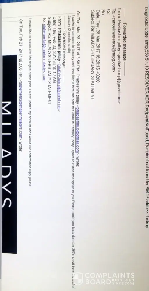I have a account with milady account no. [protected]. I visited you store on twice, I.E Jan 2017 and march 2017 and sent two mail on 21/02/[protected] and28/03/2017 to cancel your 360 deg subscription but this seem not work.I am led to believe that a company of your size as got workers to take care of customer complain but if I don not pay on time the company me promptly. I need to know how will get 4 months credit from your company. There is 10 days before next installment due I hope my problem is sorted out