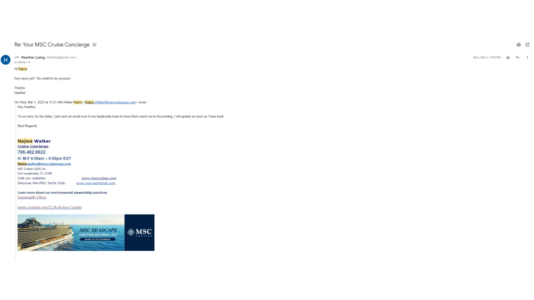 6. March 1st, 2023 I sent an email enquiring about the refund . The response was she sent an email to her leadership team to have them reach out to accounting and email me back.
