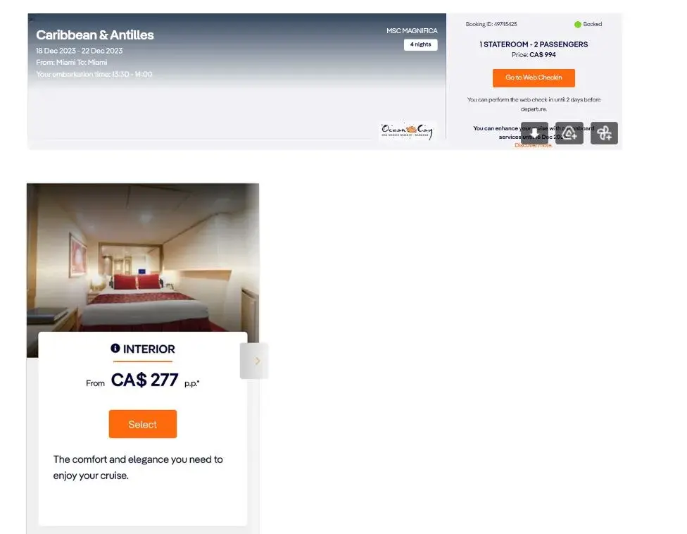 1. On February 2nd, 2023 I called MSC cruises to book two cabins for a 7 day cruise on February 18th to 26th 2023 from Martinique.
