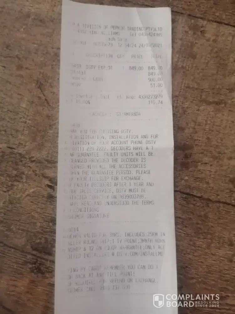 On 18 September 2021 I ordered 2 decoders on the DSTV website, an explora ultra for R1999 and an explora 3b for R999. R2998 went of my credit card immediately but I received no sales order number. Initially mydstv account said the orders were placed. When I did not receive them and checked on my online dstv account again it said I had no ourstanding orders. Numerous calls and emails and online chats with various helpdesk agents. All said they would escalate query, one said it was escalated to second line, one said technical department had sorted matter out and decoders were now at couriers. They did not say which couriers or supply me with a number to track with the couriers. No couriers ever called although helpdesk claimed couriers tried to deliver. I suspect fraud on DSTV website.