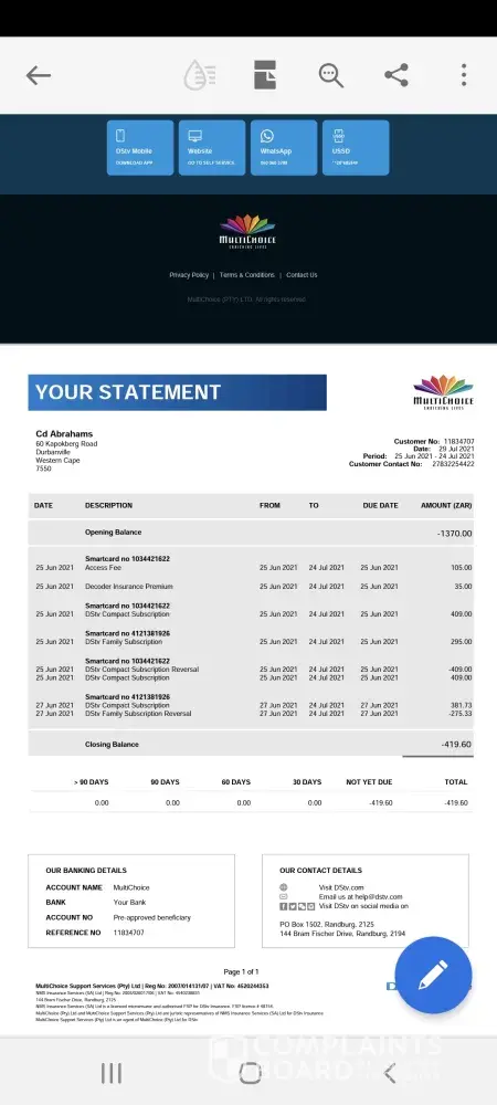 Good day . I would like to report unauthorized access to my dstv account. packages have been added and credit without my knowledge. I only realised this when i saw i owed DSTV an amount of over R2000. I went into your Multichoice Cape Town branch at N1 City on 31 July 2021 and asked a manager to assist - who unfortunately did not know what he was talking about and told me to pay an amount cos one of their DSTV service centre staff members done a double credit on my account without my knowledge and i don't see how this is my problem or concern. He said i needed to pay that amount as i used the service. i dont check my bank account or debit orders to see what gets deducted or not but i paid anyway as i saw his statmement fair. I paid an additional amount of R1377 extra to the amount that was already debited from my bank account. i asked for my account to be cancelled immediately as i wanted nothing more to do with them. i walked out, checked my account only to find it was not cancelled. i went back in to DSTV and asked to speak to another manager who advised i did not have to pay the amount as it was not my mistake and said my account had not been cancelled yet. i asked him to cancel it and they cancelled it and he said there would be a refund due and asked if they could use my debit order banking details and i said yes they can. Up until today i have spoken to over 5 customer service agents via their live chat platform and every single one of them is giving me a different story as to how to get my refund. i honestly just want my money and get rid of this people and not deal with them at all anymore. Please assist as i am tired of it all and i have had it. during this time packages have been added and credited as well. Please can someone just sort this out and equally train all your staff members the same way with the same information. i come from customer service and this is horrible service even from a manager. A few names i remember is Lelo, Nthabiseng, Ntokozo - all giving me different information about a refund due to me. I do not remember the manager's name as i was not going to complain but did not know it would drag out so long. i just need assisting and asap. Thanks so much. Best regards.