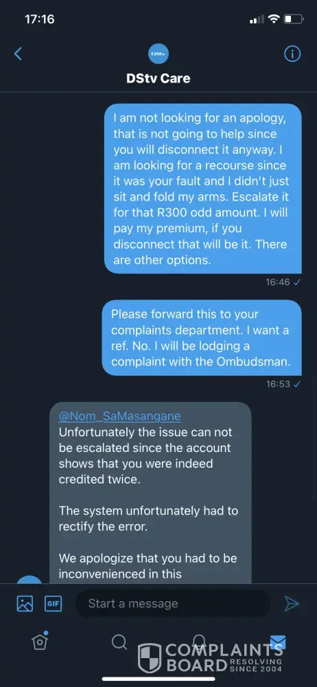 I was called by a lady claiming to be a consultant from multichoice with all my profile details from multichoice claiming to give me a special package of DSTV Explora, Netflix and Showmax to addition TV that I have that are not smart TV at R179 package at first I wS so reluctant she keeps on calling me until I was convinced at April, the decoder was delivered and I called multichoice and they told me they know nothing about the special offer and no one Called me till today, the packaging didn't even have contacts or address for On Air, the debit went through and I reverse the debit order so they can pay attention to me and indeed they called wanted to know why the debit order didn't go through and I told them why and they put me through customer service to make a complain Ref No [protected]-171908 they promised to contact me within 2 days they are still investigating, here comes the following months the debit order went through again and I reverse it they called again put me through customer service I quoted the same ref no this time they promised to come and collect the decoder and cancel the contract till today it never happened but the debit order is going through every months. Please assist.