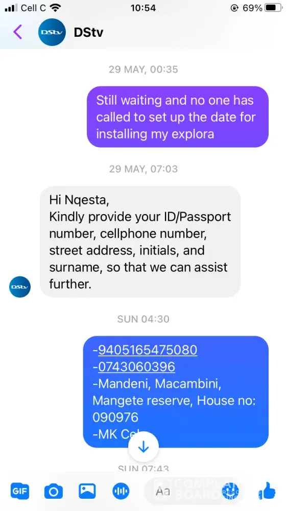 On 5th of May 2021 I requested the pricelock 24months contract but up until today 1st of June 2021 I have not received my decoder. I have been calling DSTV consultants for several times but nothing happening. They all telling me to wait. I can't wait anymore, I need to know if this installation will ever happen or not. On the 18th May 2021 the consultants promise me that installers will come to set up the decoder and she even set up the time. I even stayed home the whole to make show they find me when they come. There attachments to prove what I am saying. The sad thing is I keep on wasting my airtime calling you but no progress regarding this request.