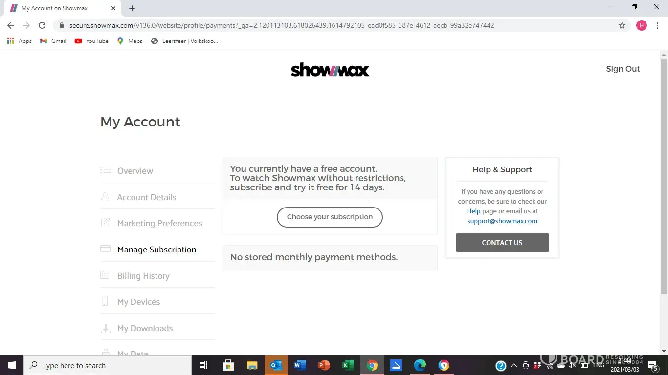 Attached please find a screenshot of my "free" subscription to Showmax that is apparently linked to my Dstv account. Apart from the fact that it is free, it does not work. When I did try to activate the service in November of 2020, it gave an error message on my PC, and after struggling with the matter for a few hours, I gave up and did not bother with it again. We watch the many many reruns on Dstv.