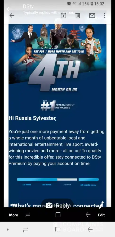 They had a promotion where you pay for 3 months and get the 4th month for free. When it got to my 4th month I enquired about it and 2 agents on different occasion assured me my 4th month is this month and that it would be free. I received a sms saying my account was over due and contacted a agent again via Facebook messanger. This agent kept me waiting the whole weekend on feedback and just kept saying they appreciate my patience. This morning my services was put off this is very bad service after they promised a free month they don't adhere to it and agents are useless at helping
