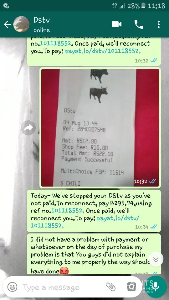 I received an SMS on Saturday 18th August, telling me that my DSTV services has been turned off as I owe them R63.87 and I must pay them immediately to have my services re connected. I was not happy as I pay monthly by DD and I have done for the past 18 years! Never in that time have they not been paid on time all the time.