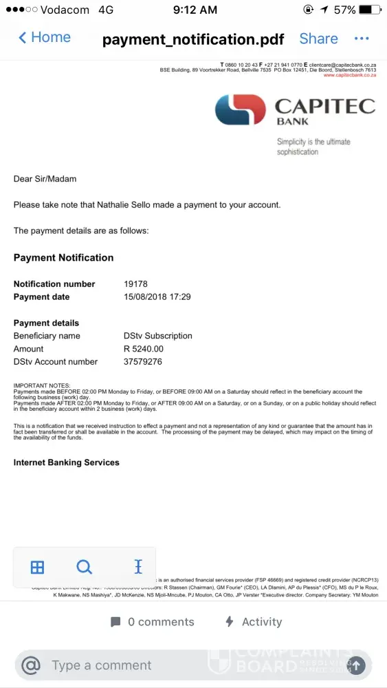 It appeared that THEY made the mistake but the R63.87 was owed, OK fine so please just take the money now as you have my permission or take the extra on the 4th September... NO, we cant do that you must pay now by EFT.. so I refuse to do this, it's not my fault, I was given zero notice that i owed you R63.87, no email, no SMS, no letter, no what's app.
