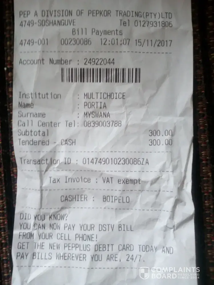On the 15 of November 2017 I went to my nearest pep branch at soshanguve crossing to make a payment for my dstv so I am so annoyed and irritated by the fact that its almost a week now and its still not working or playing, I've called the So I called multi choice on012422222 and I still couldn't get help so currently am out of airtime and I can't call so please advise what to do because am so annoyed and out of airtime calling a landline is very costly and I don't have that much ...please and please help