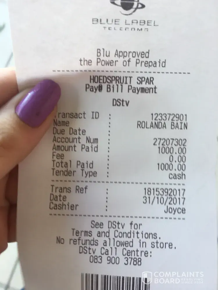 Hi I am not a happy client ypu switched my dstv off again and i did make a payment of R1000, 00 on the 31st of October my refrence number is [protected] I am Rolanda Bain and i will not pay another fee to switched it on, I am really not satisfied dstv!