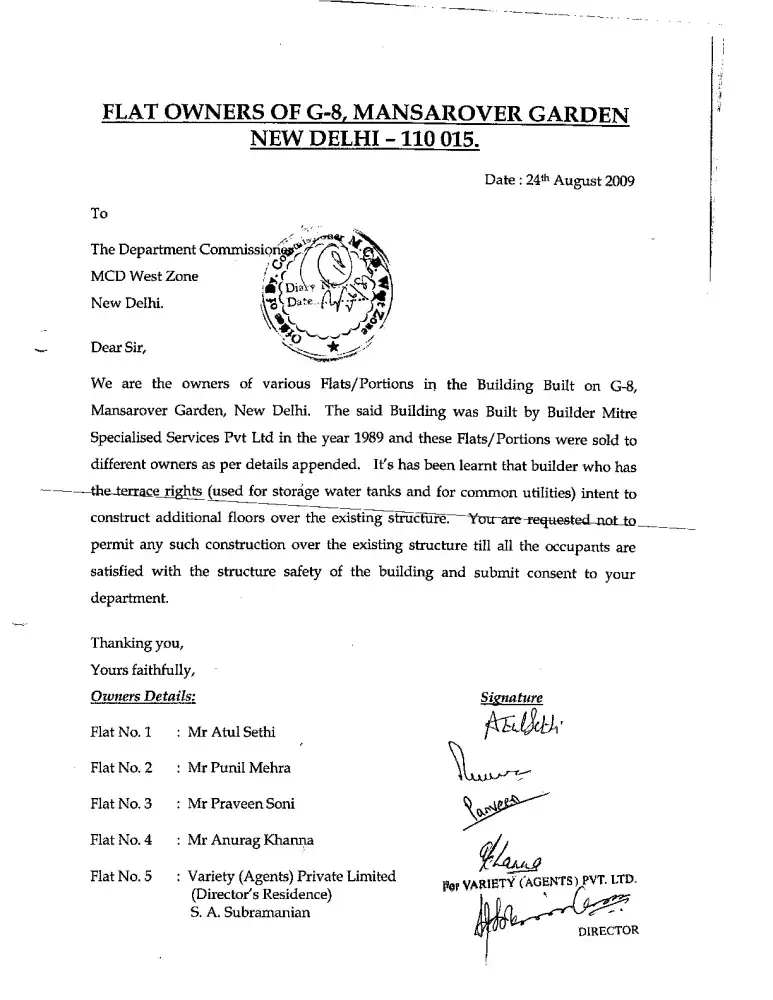 We are the owners of various Flats/Portions in the Building Built on G-8, Mansarover Garden, New Delhi. The said Building was Built by Builder Mitre Specialised Services Pvt Ltd in the year 1989 and these Flats/Portions were sold to different owners as per details appended. It’s has been learnt that builder who has the terrace rights (used for storage water tanks and for common utilities) intent to construct additional floors over the existing structure. You are requested not to permit any such construction over the existing structure till all the occupants are satisfied with the structure safety of the building and submit consent to your department.