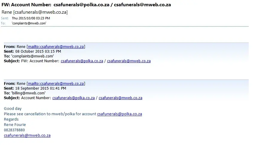I cancelled my email address which polka gave me - when I purchased a computer through them - On 14th of May 2013 I emailed [protected]@mweb.co.za to cancel [protected]@polka.co.za - I thought the email was cancelled. Again an email was send on 26th of Feb 2014 where I specifically ask Mweb to cancel all other products which they are deducting through my account but leave my one primary email address. When Mweb did not take notice - I cancelled my debit order. I made a complaint on Hello Peter - one agent tried to assist me and then he also disappear - I emailed all my emails to Mweb Accounts for their notification - I thought everything is resolved...all of a sudden I get a sms I am being put on Credit Bureau for non payment...Mweb call center was phoned ...the lady told me I did not send any emails as proof - but my hole box is full of proof of send emails...She does not even want to listen to me and told me rudely to pay my mweb account - even a double amount? No Mweb your customer services are bad - they don't read. It is very disappointing - account 9676395/7125763. I get no satisfactory service from them. Regards Rene Fourie [protected]