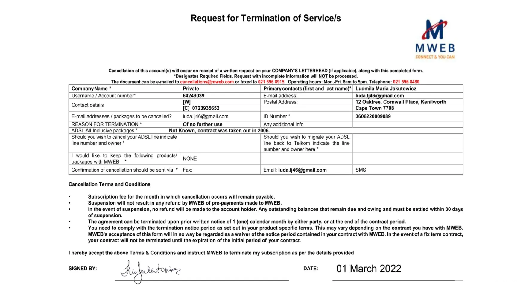 Desired outcome: I want to terminate my contract with Mweb and the debit order as of 31 March 2023.