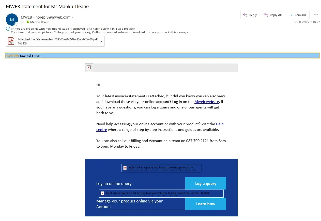 On the 12th of February after my complaint on social media, I got this response from MetroFibre: ''I will escalate the matter to our Key Accounts departments to assist accordingly."