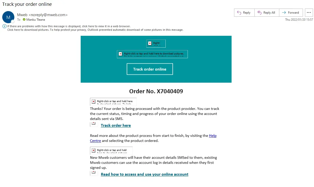 The latest was that Mweb will come to my house to bring a loan Wi-Fi router and this will take approximately 2 weeks before they have a router available. This never happened.