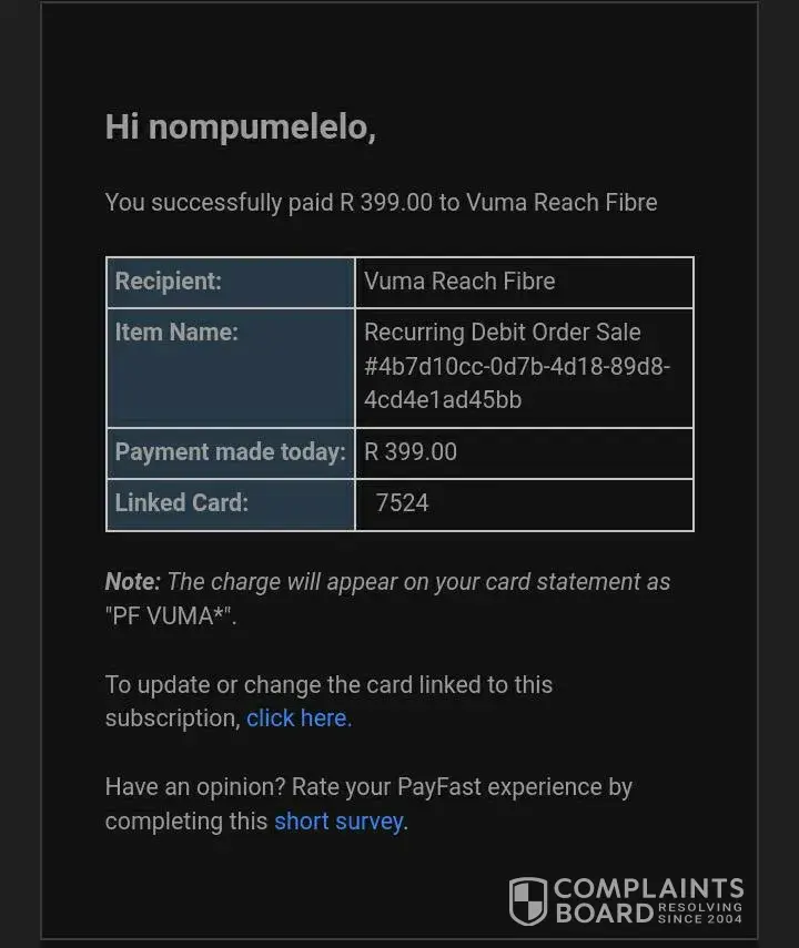 On the 25th made r400 payment for uncapped fibre, customer service was ok at the time, the following day a team came to do installations went relatively quick my internet was up and running on the Saturday, 3 days later my ISP is put off I get an email regarding a debit order for the new month, I specifically told the agent debit order to be done on the 26th yet my account shows debit order on the first of every month, in actual fact I paid r400 for only 3 days connectivity and now I need to pay another r400 3 days later unacceptable and now I have to cancel my contract just to just a simple debit order date that was an error on their side
