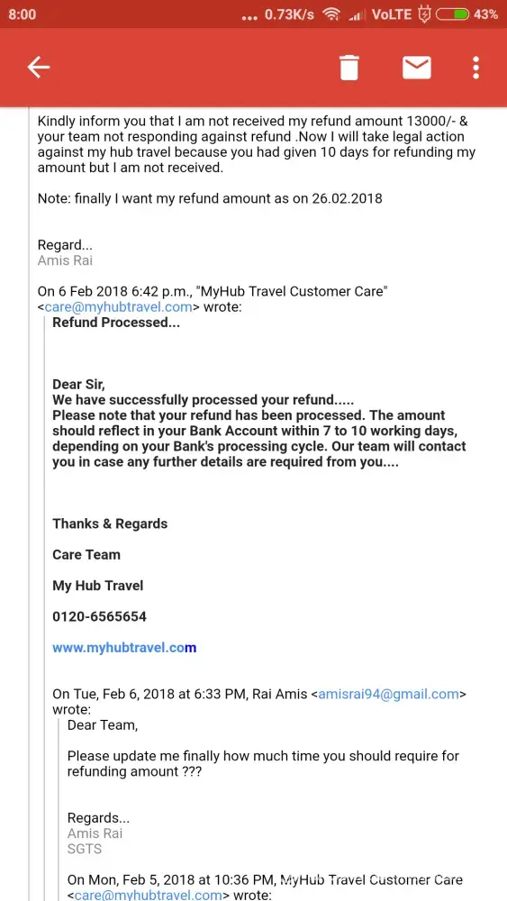 This is to inform you that I got a call from Mr.Ankit Agrawal 9654523156, an employee in My hub travels. He listened to my issue and spoke to me very politely. After a long discussion with me he assured me that he will refund my money within three weeks as per their refund policy. I am fully satisfied with their quick response. It all happened because of misunderstanding of an employee. I express my thanks to the entire team of My hub travels for their good customer care attitude. Now I am confident use their services.