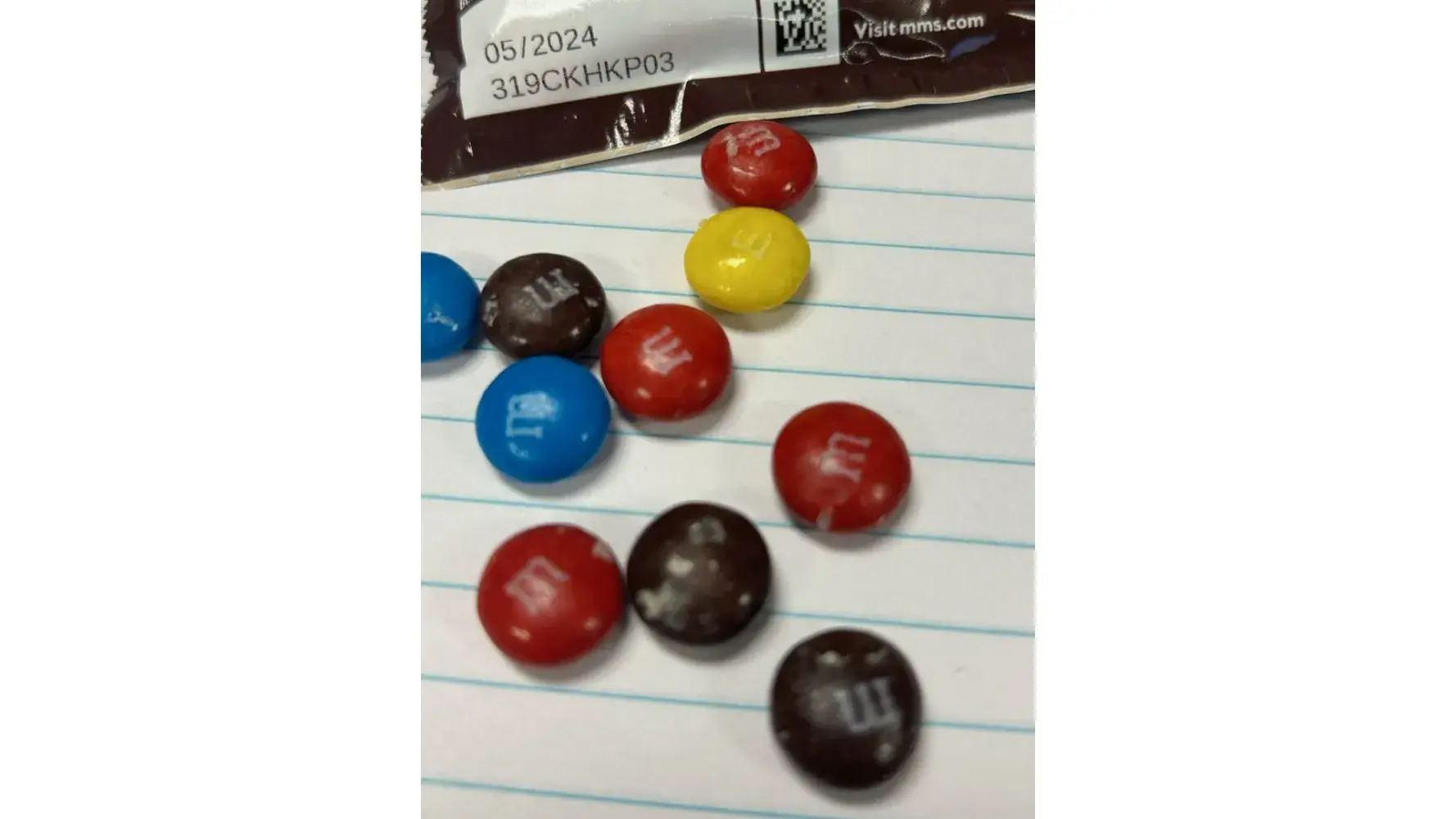 I just bought a bag of M&M's plain candies out of the vending machine at my job: 35 Nutmeg Dr Trumbull, CT 06611 on 10/12/2023 and there was a waxy white substance on them and it had a sour milk smell. I hope it's not bad for me as I did eat some and then noticed some white waxy stuff on my hand. I hope i don't get sick or get the runs from eating them that would be awful. The code on the bag is 05/2024 319CKHKP03