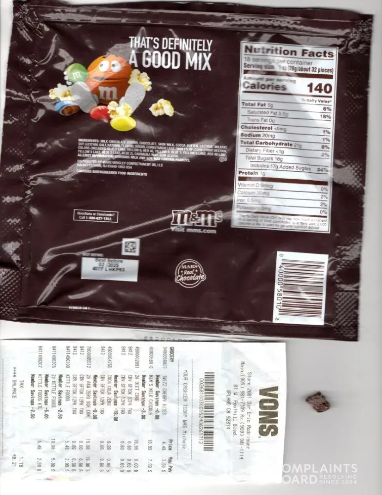 To whom it may concern, I recently purchased a bag of milk chocolate M&MS (family size). The bag was purchased on 6/26/24 at a Von's grocery store at 81 W Foothill Blvd. Upland, CA. As my wife was eating some, she bit down and was surprised that there was a hard piece of plastic about the size of a regular M&M. It was upsetting but we were thankful that our granddaughter was not the one who had been affected and possibly choked or something even worse. I have the bag, the plastic piece and the store receipt if needed. I would really appreciate it if someone would contact me at my email address [protected]@msn.com.