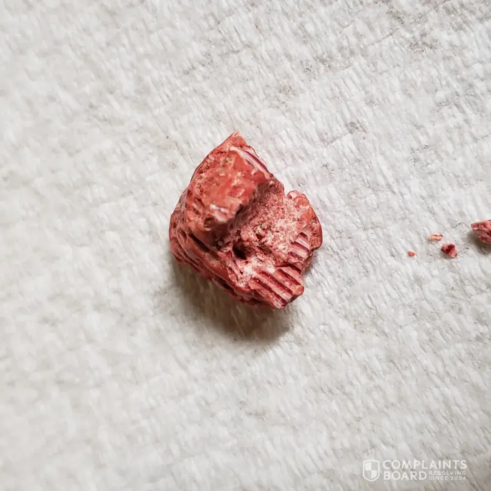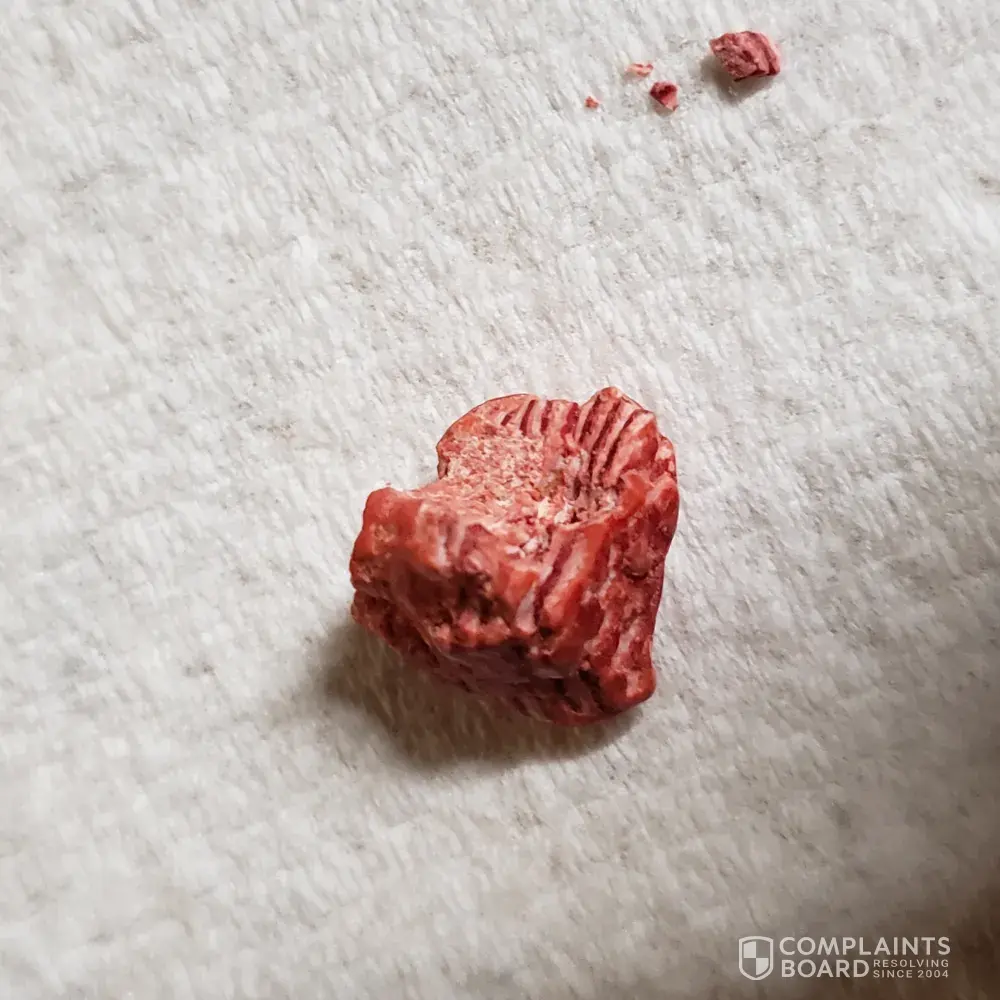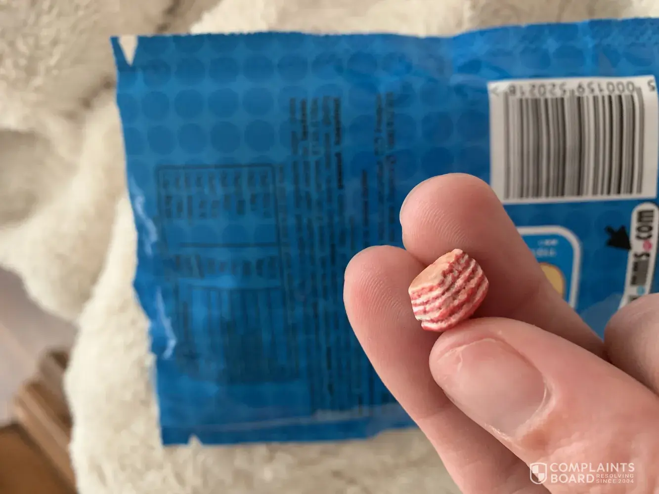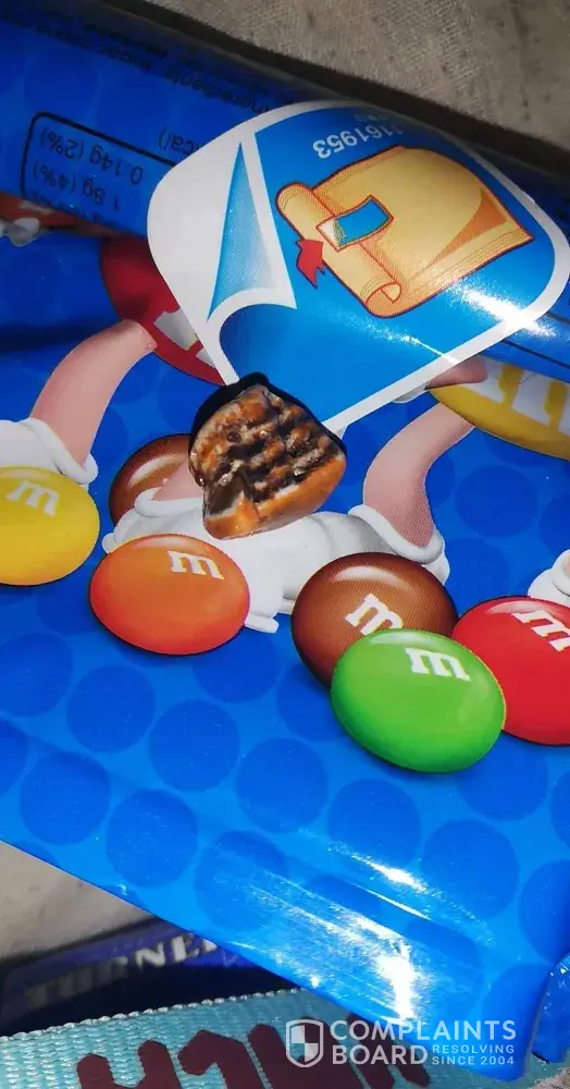 Hi I bought some m&m''s but after suckling on them till soft I chewed them and an object in the packet has broken the top off my front tooth. I looked for an identifying number on the packet but there does not appear to be one. I have attached some photos of the object I am very upset about it being my front tooth. If you require any more photos I am more than happy to send them.