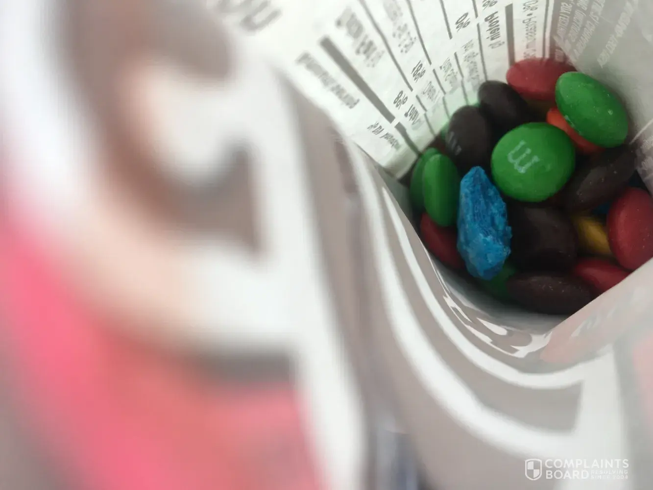 I bought this package of M&M's and my granddaughter was eating them when she began to choke after getting this foreign object stuck in her throat that came out of this package of M&M's . I'm not sure what this is but I have attached pictures for you to see. I'm extremely upset over this for one I have no idea what this and two my granddaughter choked on it. I will be waiting for a response if I don't hear from someone I will be turning this over to an attorney.
