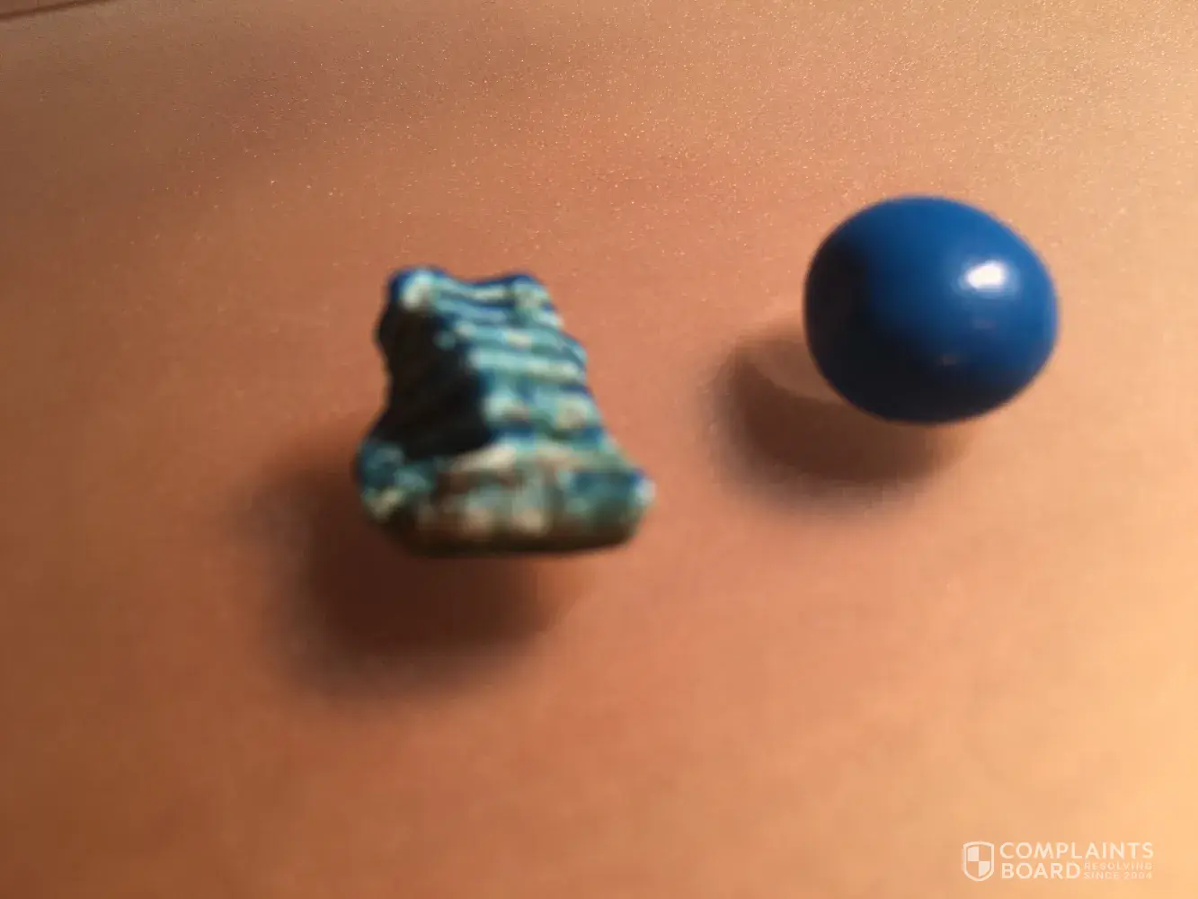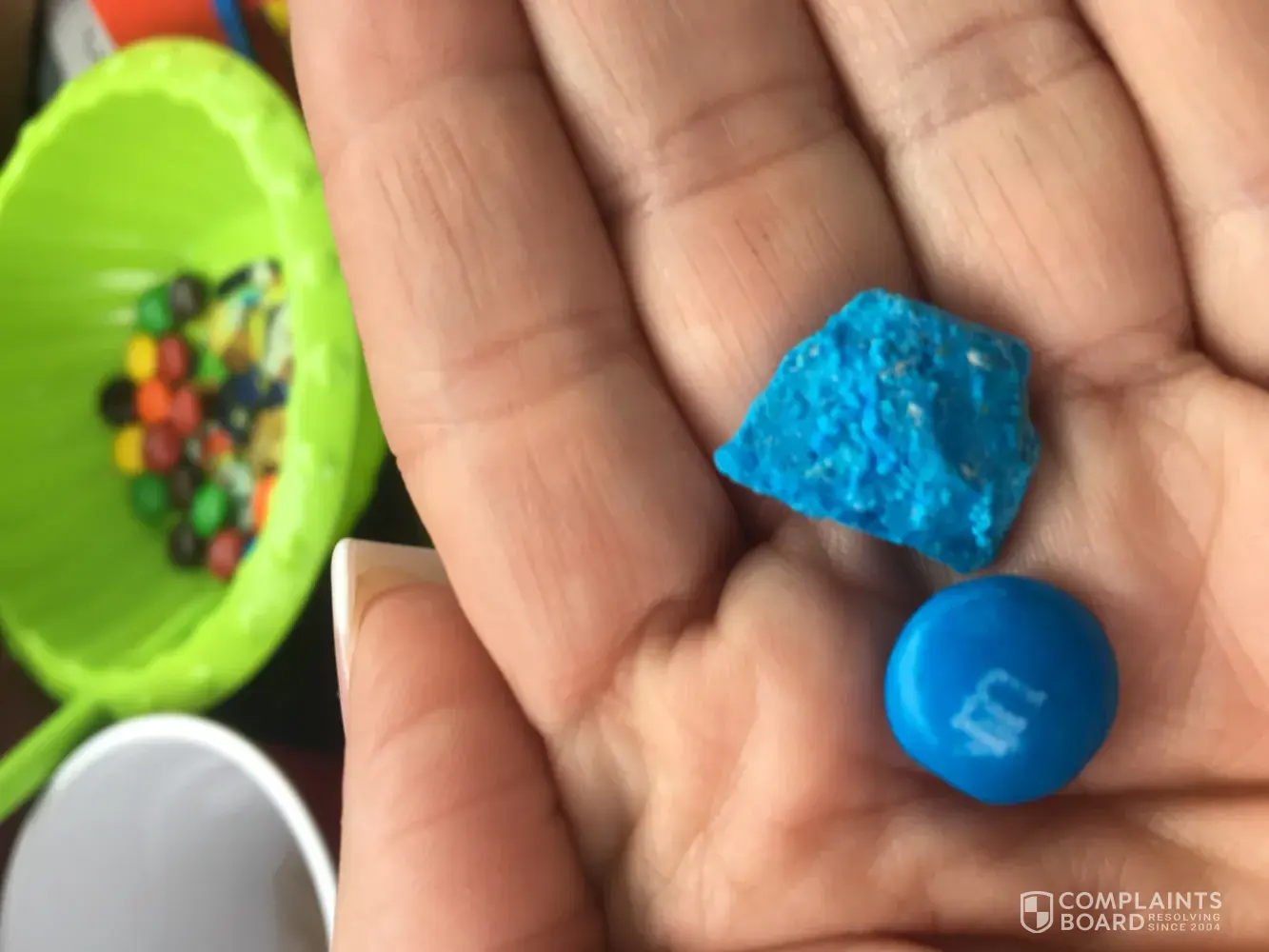 I bought a share bag of regular m&m at a Home Depot in Pennsylvania an I opened the bag when me an my 4 year old daughter got in the car An I poured some out in her bowl An there was a mouth size blue ROCK in the bag she could have eaten it! Who knows what could have happened I'm thankful enough I found it before anything tragically happened to my 4 year old daughter !