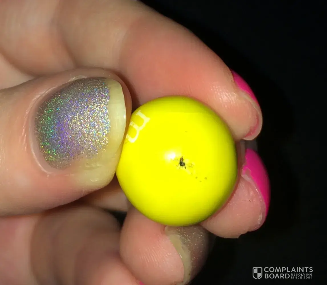 I was enjoying my m&m's when suddenly I noticed a black spot on one of them. When I investigated further I came to realise it was a small fly, squashed into the sweet. I felt ill after seeing this and was very unhappy and unable to enjoy the rest of the sweets. I have attached photos down below.