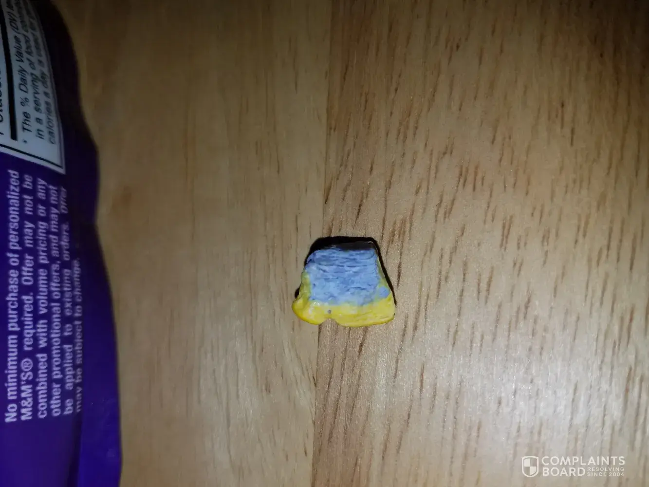 Found this yellow/ gray chunk in the bag of M&Ms I was about to eat. Upon Closer observation, it is definitely metal with yellow paint on 1 side. Hard as a rock. Look at pictures below for metal piece and the lot number. I am Not going to eat anything from this bag so please refund me. Look at your manufacturing equipment for other faults & recall this lot asap before someone chokes or breakes their teeth. Please respond with a resolution.