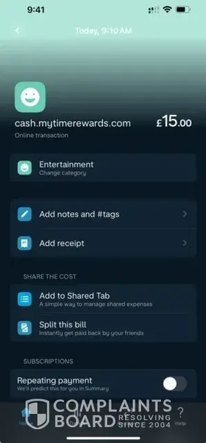 So why for past few months of me having monzo out of no we’re CASH MY TIME REWARDS is taking 15 pound of of my bank every 2weeks or so it’s getting frustrating now cus I don’t know why the hell it’s taking 15 pound out for no reason I don’t have any debts or nothing to be paid so idk why it doing this if I don’t get this money bk I have informed the bank so !