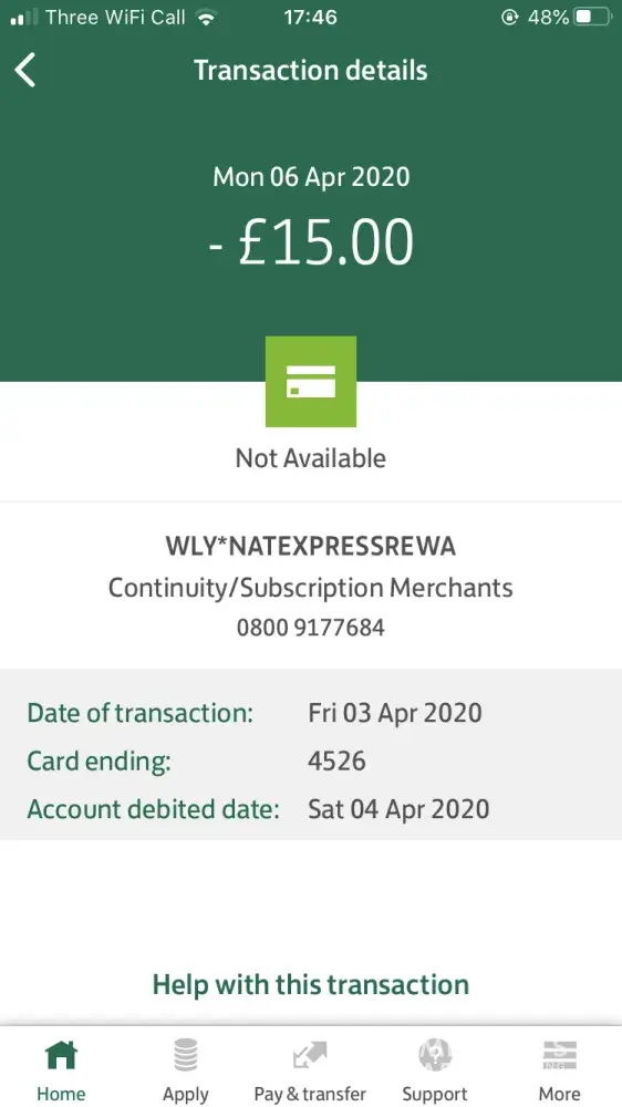 As I have gone to look at my transactions on my online lloyd's banking app I had seen a transaction from ‘wly*natexpressrewa' which I don't know about and I did not give any permission for this and this was done without my knowledge. I cannot contact them as they've closed because of the corona virus outbreak however I would like to find out why this transaction was made and a refund.